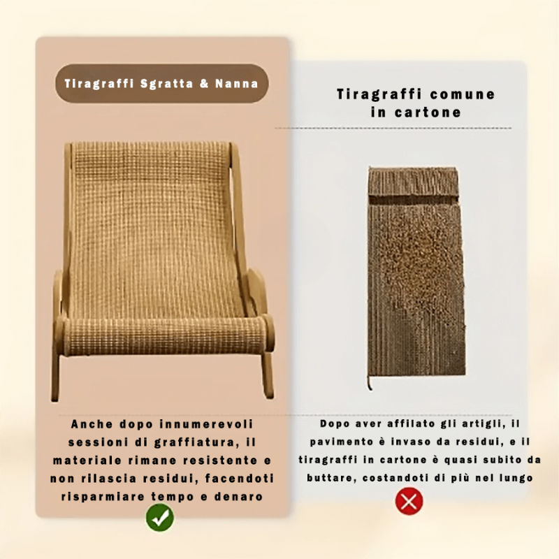 Assolutamente! La nostra poltrona è progettata per soddisfare i due istinti primari del gatto: graffiare e riposare. La superficie in sisal naturale è irresistibile per gli artigli, mentre la forma ergonomica e i materiali confortevoli la rendono una cuccia ideale. Il 98% dei gatti la preferisce ad altri tiragraffi!